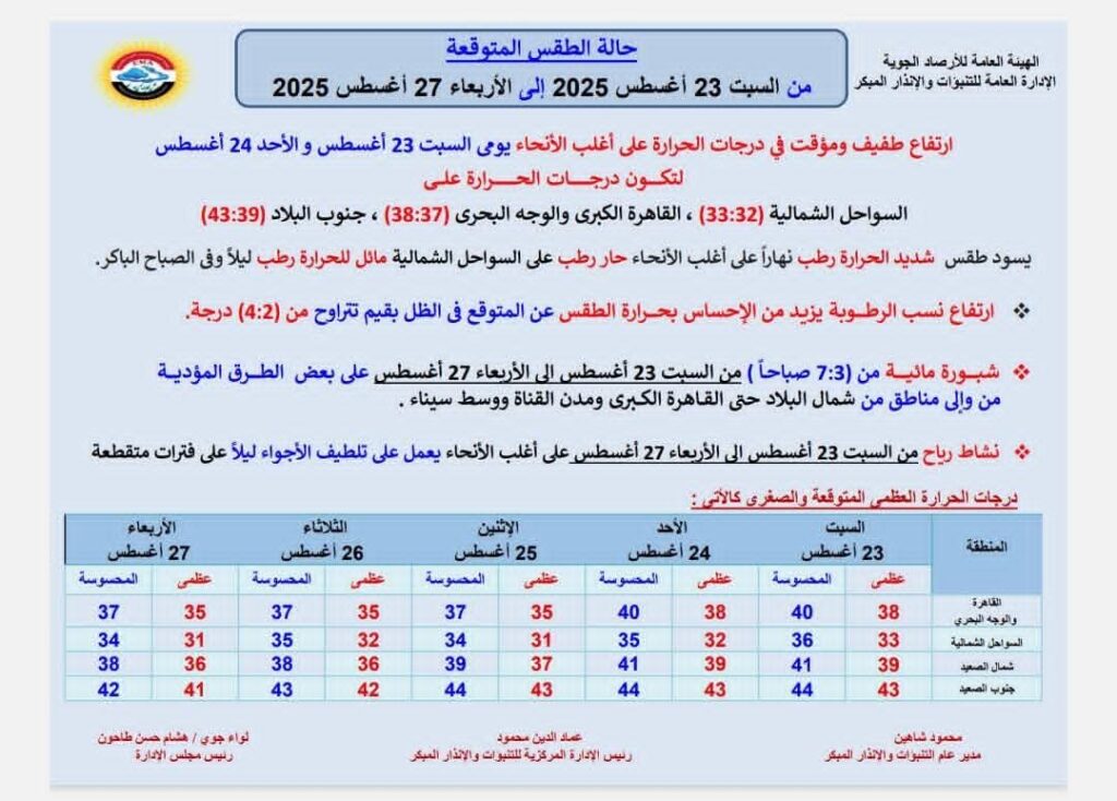 أوضحت الهيئة في تقريرها التفصيلي أن البلاد ستشهد ارتفاعاً طفيفاً ومؤقتاً في درجات الحرارة خلال يومي السبت والأحد المقبلين، حيث تتوقع أن تصل درجات الحرارة على السواحل الشمالية إلى 32-33 درجة مئوية، وفي منطقة القاهرة الكبرى والوجه البحري إلى 37-38 درجة، بينما ترتفع في جنوب البلاد لتسجل بين 39 و43 درجة مئوية.