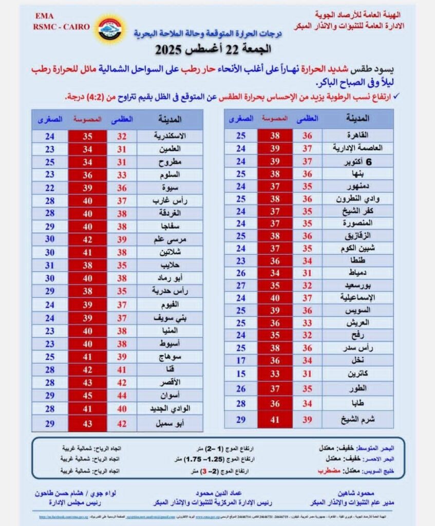 كشفت الهيئة العامة للأرصاد الجوية عن تفاصيل الحالة الجوية المتوقعة على مختلف مناطق الجمهورية، حيث من المنتظر أن يسود طقس حار رطب نهاراً على معظم المناطق، بينما يظل الطقس شديد الحرارة مع ارتفاع في نسبة الرطوبة على جنوب الصعيد ومنطقة جنوب سيناء.