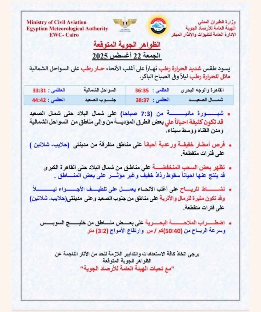 اضطراب الملاحة البحرية: تحذر الأرصاد من اضطراب الملاحة على البحر الأحمر وخليج السويس، حيث تتراوح سرعة الرياح بين 40 و50 كم/س، ويصل ارتفاع الأمواج إلى 2-3 أمتار.