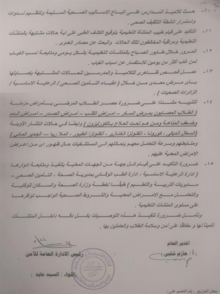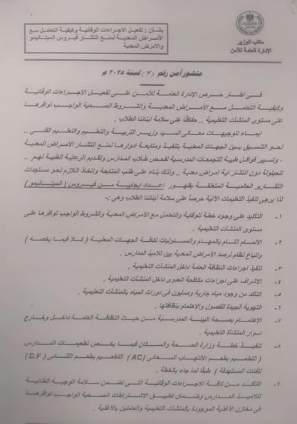 عاجل وزارة التربية والتعليم تفعيل الإجراءات الوقائية لمنع انتشار فيروس الميتانيمو